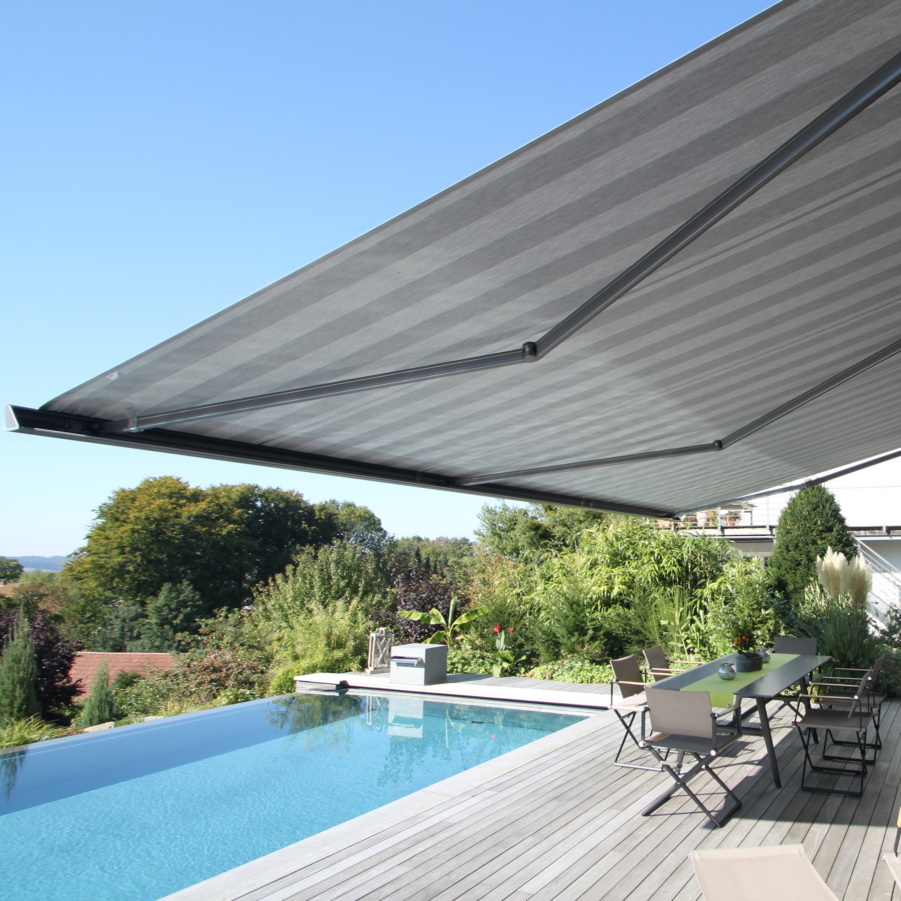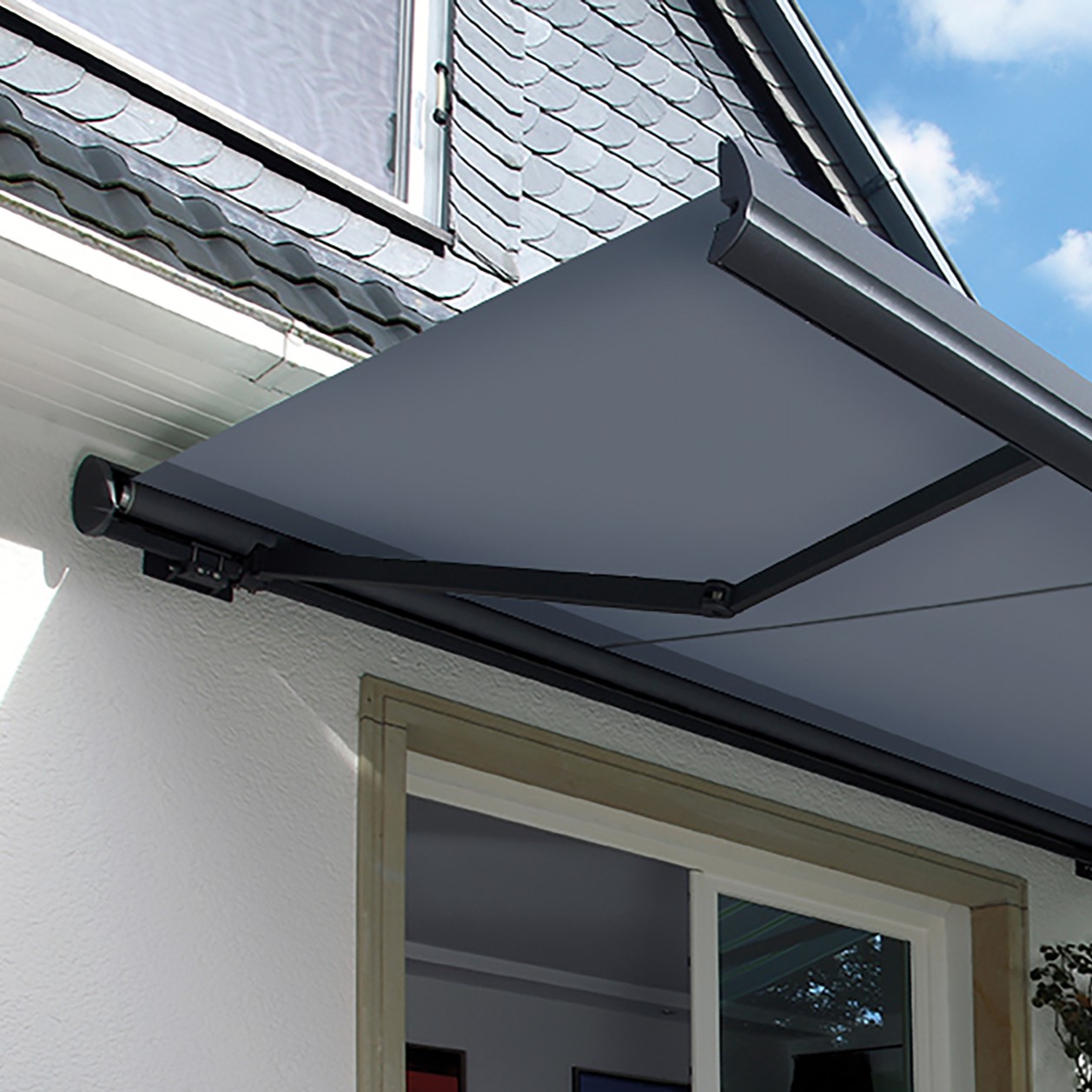 Die halbgeschlossene Gelenkarmmarkise bietet einen guten Kompromiss aus Design und Schutz. Das Markisentuch ist im eingefahrenen Zustand weitgehend vor Witterungseinflüssen geschützt, während die Konstruktion optisch leicht bleibt. Sie eignet sich besonders für Fassaden mit teilweiser Überdachung. Erweiterungen wie LED-Beleuchtung, Volant, Motorisierung oder Smart-Home-Anbindung sind möglich.